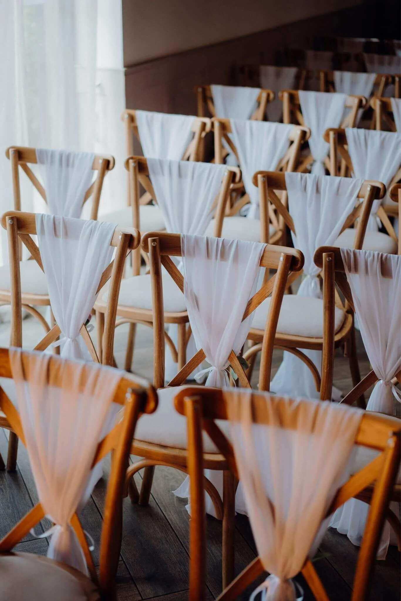 With a vast and growing array of chiffon and cheesecloth drapes most suited to venues with chivari or crossback chairs we can create many different styles. For venues with banquet chairs we stock chair covers which work well with bows, chiffon hoods and ruffles.